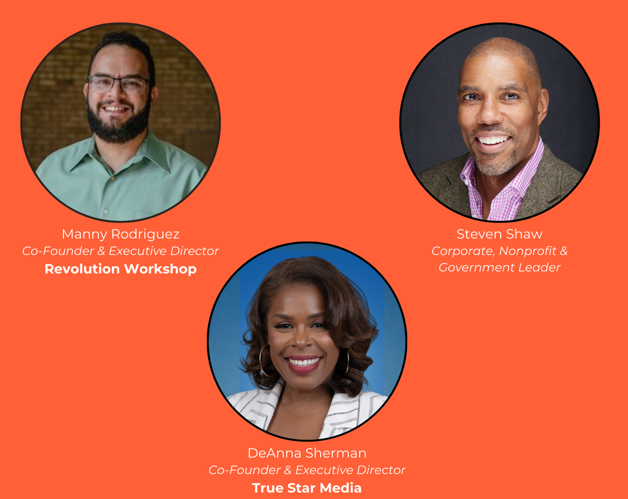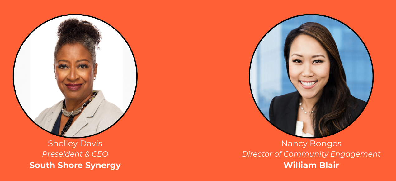 Moderator Shelley Davis (President & CEO, South Shore Synergy) will be joined by panelists Nancy Bonges (Director of Community Engagement, William Blair), Manny Rodriguez (Co-founder and Executive Director, Revolution Workshop), Steven Shaw, (Community Engagement Director, Verizon), and DeAnna Sherman (Co-Founder and Executive Director, True Star Media).