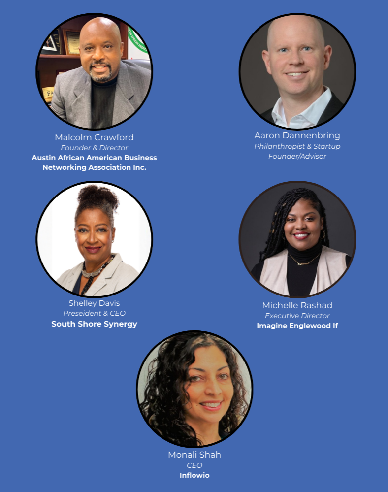 Moderator Shelley Davis (President & CEO, South Shore Synergy) will be joined by panelists Malcolm Crawford (Founder & Director, Austin African American Business Networking Association Inc.), Aaron Dannenbring (Philanthropist & Startup Founder/Advisor), Michelle Rashad, (Executive Director, Imagine Englewood If), and Monali Shah (CEO, Inflowio).